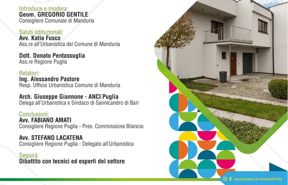 Due le relazioni, che saranno tenute da Alessandro Pastore, responsabile dell’Ufficio Urbanistica del Comune di Manduria, e da Giuseppe Giannone, componente di ANCI Puglia e sindaco di Sannicandro di Bari.