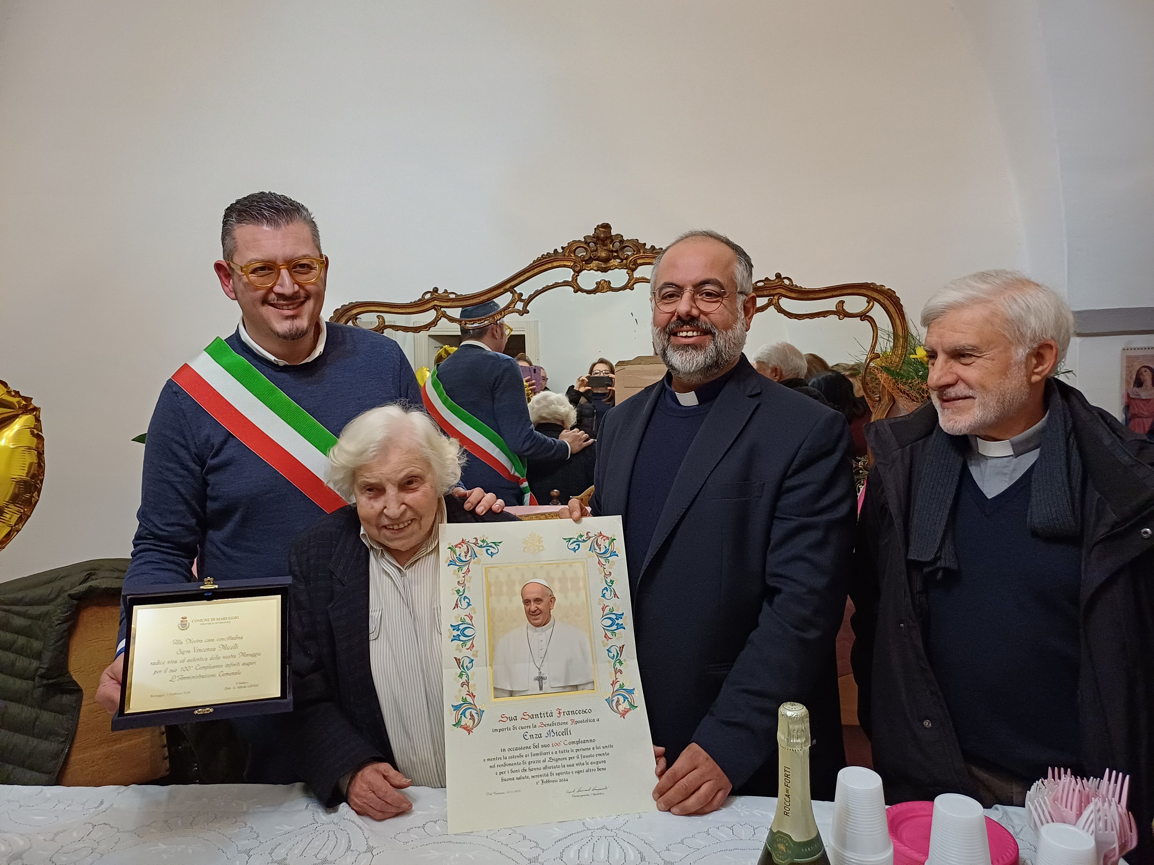 I 100 anni di Enza Micelli, festeggiata ieri, oltre che da tutti i suoi familiari, anche dal sindaco Alfredo Longo e da don Alessandro Mayer e don Raffaele Giuliano (nella foto).