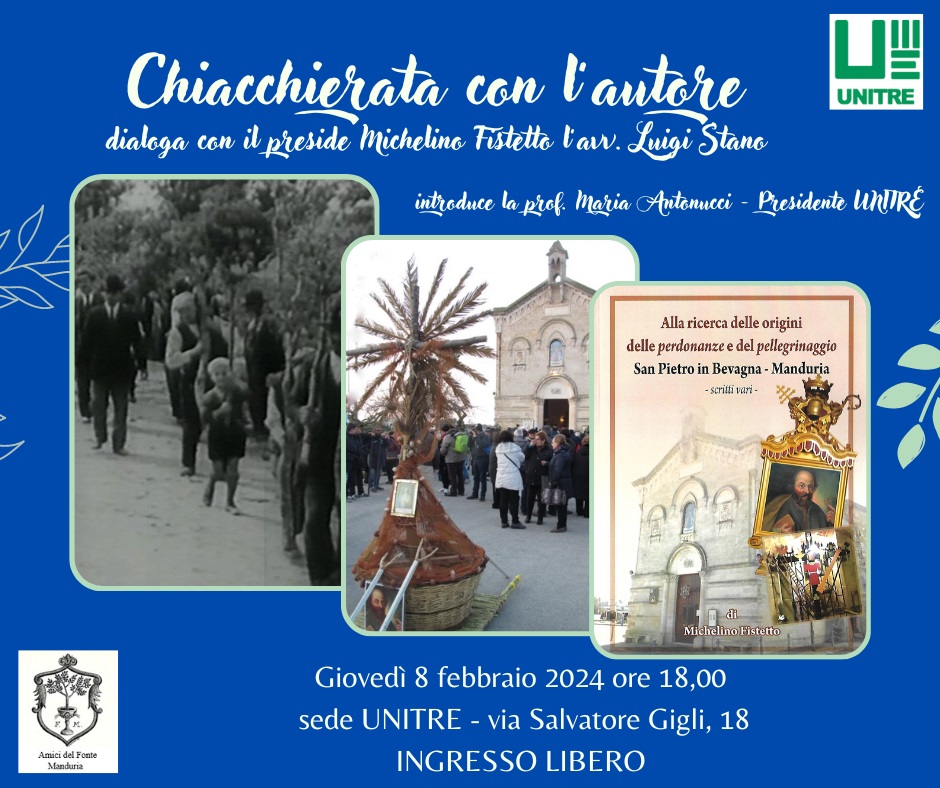 Per giovedì 8 febbraio, in occasione dell’ultima pubblicazione del preside Michelino Fistetto “Alla ricerca delle origini delle perdonanze e del pellegrinaggio San Pietro in Bevagna – Manduria”, il gruppo degli “Amici del Fonte” di Manduria ed UNITRE hanno organizzato un incontro con l’autore nella sede UNITRE, via Salvatore Gigli n.18 (convento San Francesco), alle ore 18.