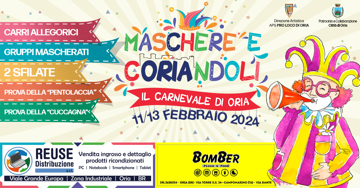 E' tutto pronto per la seconda edizione di “Maschere e Coriandoli - Il Carnevale di Oria 2024” che torna nella città federiciana dopo il successo dello scorso anno e si svolgerà domenica 11 e martedì 13 febbraio.
