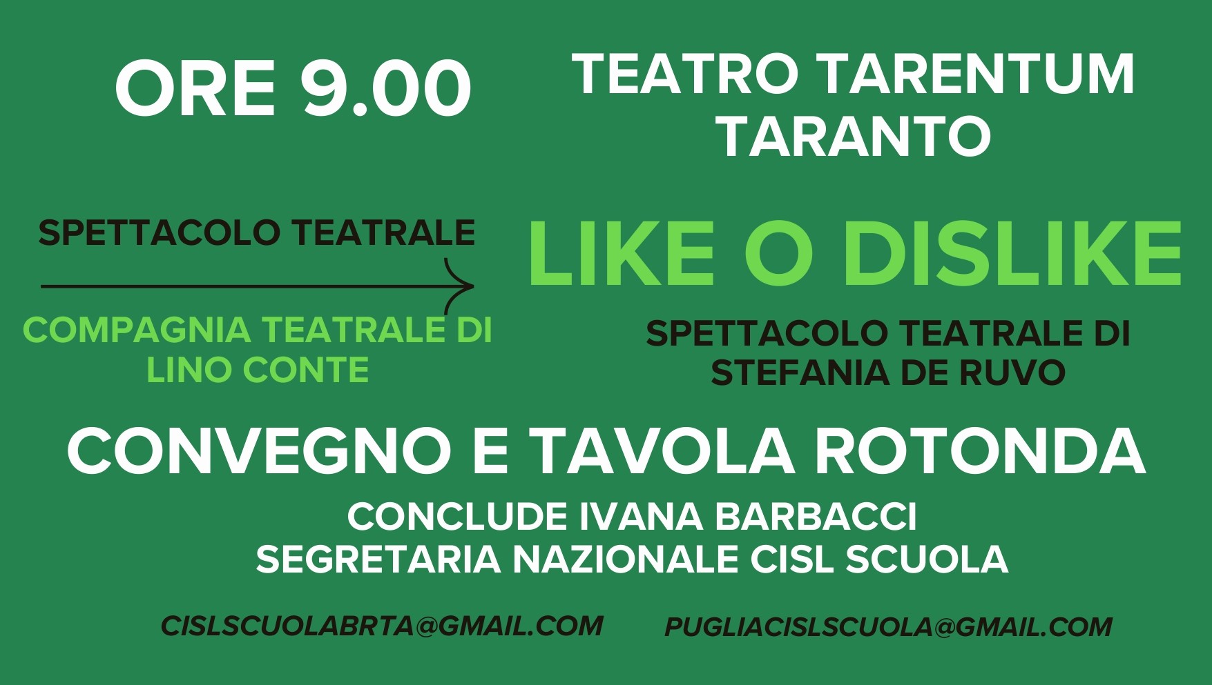 La giornata avrà inizio con una peace teatrale di Stefania De Ruvo, messa in scena da Antonello Conte, con la compagnia teatrale di Lino Conte. Si proseguirà con una tavola rotonda densa di interventi brevi ma di alto spessore coordinati dal segretario nazionale organizzativo Cisl Scuola Roberto Calienno.
