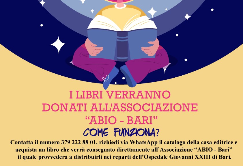 Partecipare all’iniziativa è semplicissimo, basterà contattare, via WhatsApp, la ButterflyBook ai numeri: 379 222 8801 e/o 346 7154 793 per ricevere (senza nessun obbligo ovviamente) il catalogo della casa editrice e scegliere di acquistare uno o più libri da destinare ad “ABIO Bari”. Al termine della campagna, i libri verranno consegnati direttamente ai volontari che provvederanno a distribuirli ai bambini ricoverati presso il “Giovanni XXIII” di Bari.