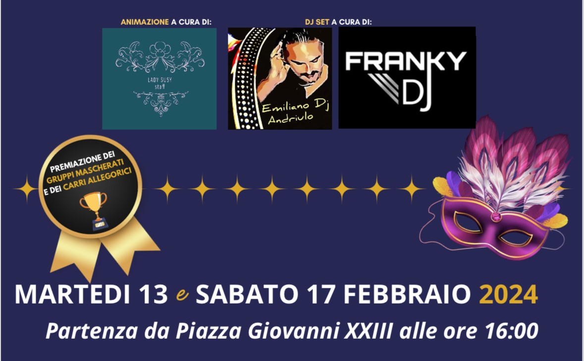 Annunciata la partecipazione di cinque carri allegorici e di diversi gruppi mascherati. Il raduno è previsto per le 15,30 in piazza Giovanni XXIII