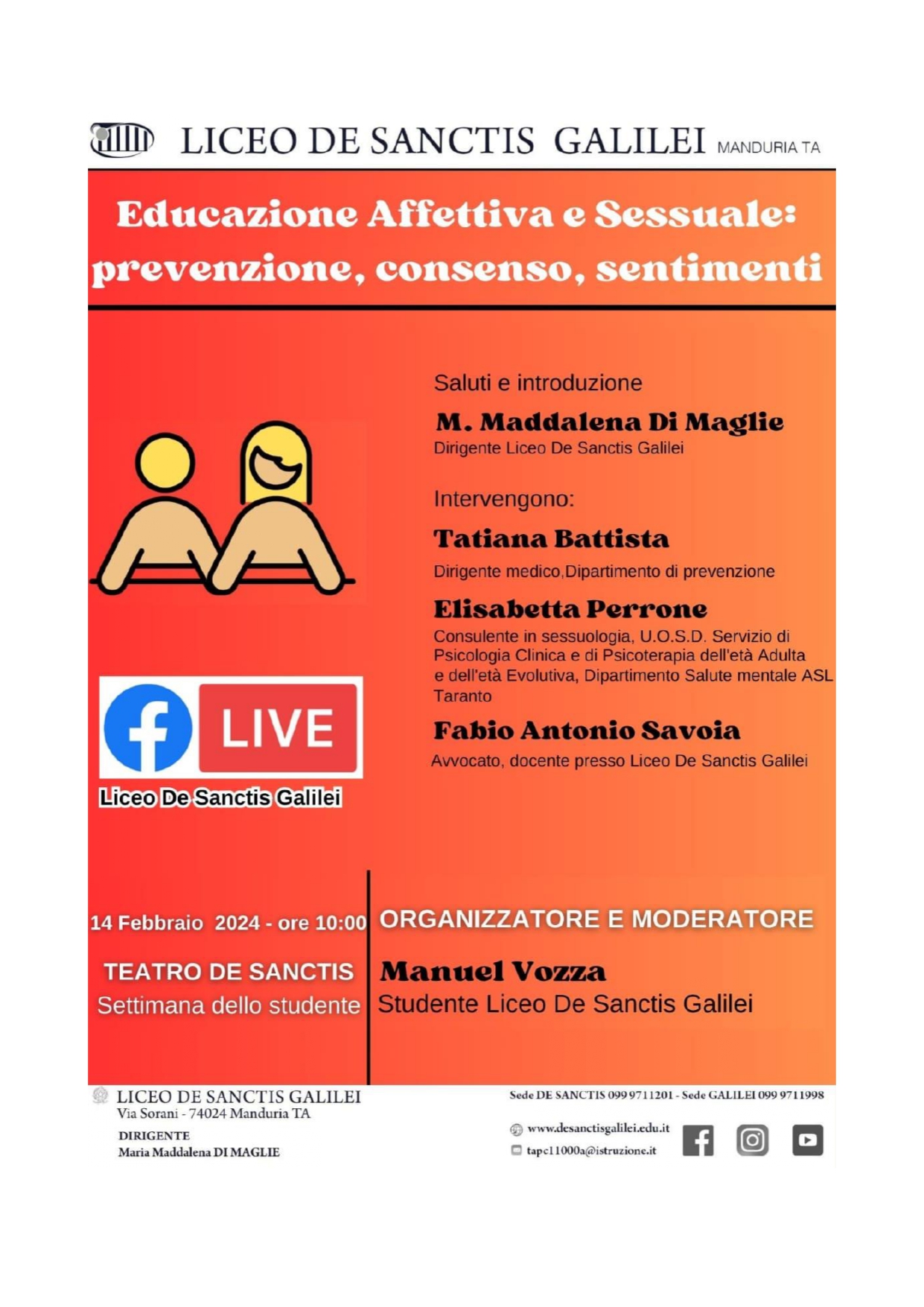 L’evento è riservato agli studenti del liceo; tutti gli altri potranno seguire la diretta sulla pagina Facebook “Liceo De Sanctis Galilei” a questo link https://facebook.com/liceodesanctisgalilei.