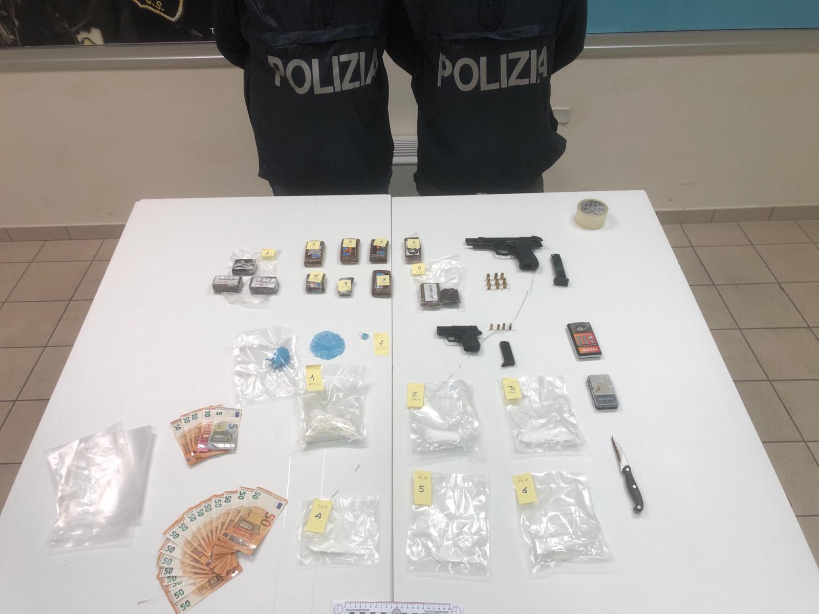 Nascosti in diversi punti dell’appartamento, i poliziotti hanno recuperato circa 320 grammi di cocaina in pietra contenuta in un bustina di plastica sottovuoto, 12 panetti di hashish per un peso di un chilogrammo circa, il necessario per il confezionamento in dosi delle sostanze stupefacenti e un’arma clandestina modificata “BRUNI” modello “92” calibro 9mm, completo di caricatore bifilare e 9 cartucce.