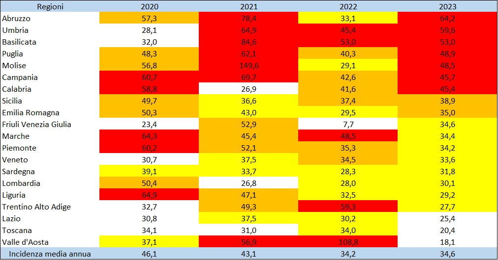 Sono Umbria, Basilicata e Campania le regioni più pericolose in cui lavorare. L’incidenza di mortalità rilevata nel quadriennio, infatti, posiziona le regioni in zona rossa per tre anni su quattro.