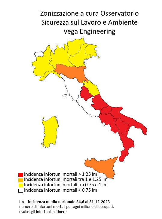 La zonizzazione utilizzata dall’Osservatorio Sicurezza e Ambiente Vega Engineering dipinge il rischio infortunistico nelle regioni italiane secondo la seguente scala di colori: