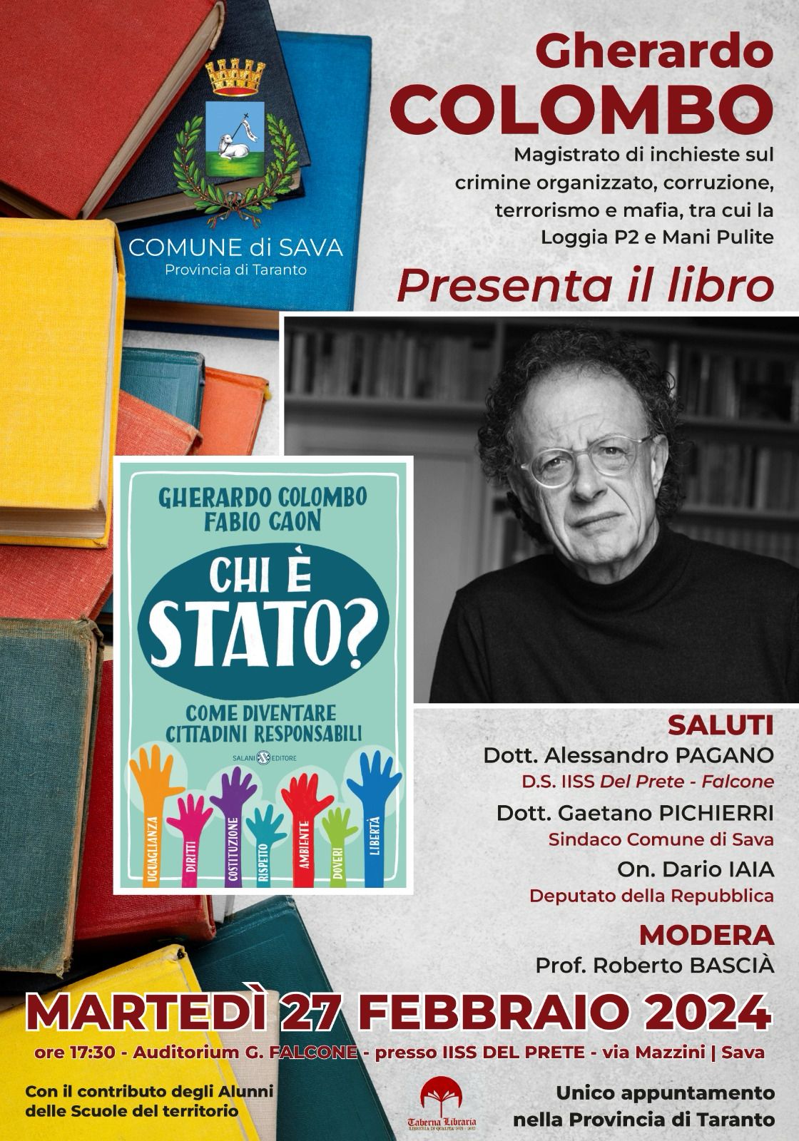Sarà la città di Sava ad ospitare, martedì, 27 febbraio 2024 Gherardo Colombo. Nell’unico appuntamento in provincia di Taranto, l’ex PM è atteso, alle 17.30, presso l’auditorium “Giovanni Falcone” di Sava, in un convegno dal titolo “Chi è stato?”, per presentare l’omonimo libro e parlare ai giovani di Costituzione e legalità, in un incontro aperto a tutti e ad ingresso libero.