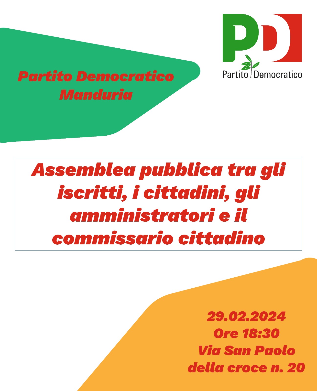 Invitiamo calorosamente tutti i cittadini a partecipare a questa assemblea che si terrà il 29 febbraio, alle ore 18.30, in via San Paolo della Croce n. 20 e che rappresenta il primo passo verso una nuova idea di Partito Democratico e di Manduria. Lavoreremo insieme per affrontare le sfide del nostro territorio e per costruire un futuro migliore per tutti».