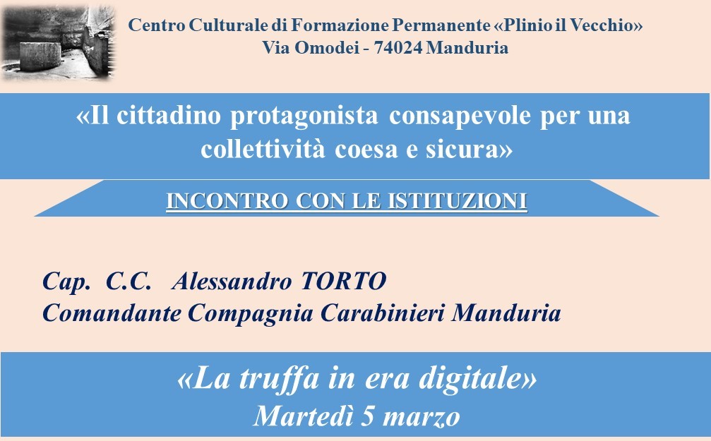 Martedì 5 marzo: il capitano Alessandro Torto, comandante della Compagnia dei Carabinieri di Manduria, relazionerà sul tema “La truffa in era digitale”.