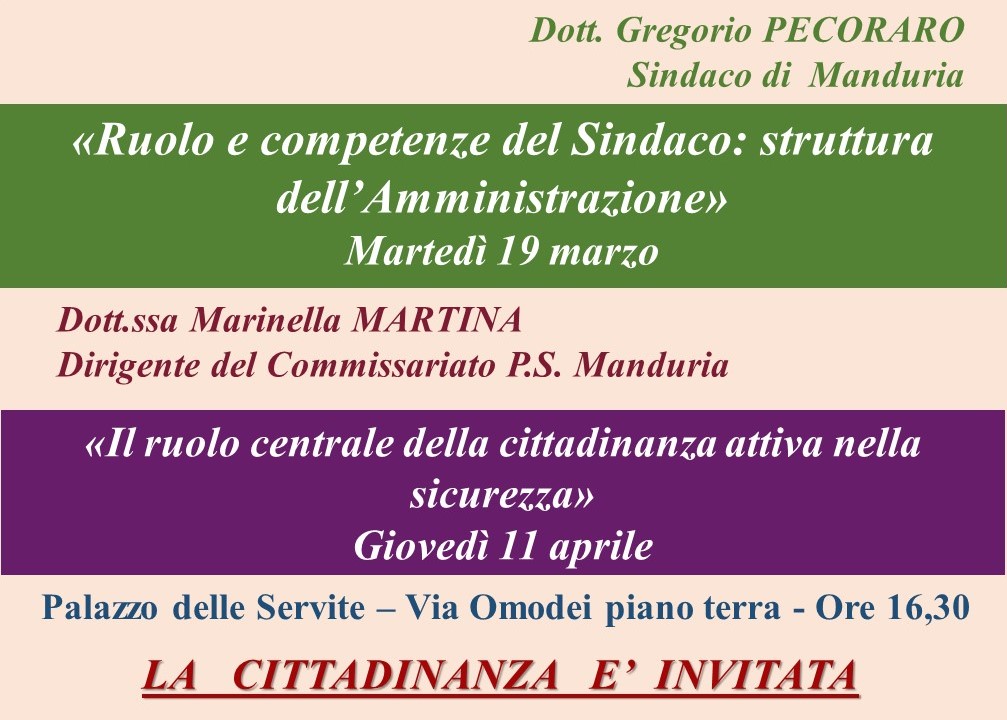 Martedì 19 marzo: Gregorio Pecoraro, sindaco di Manduria, interverrà sul tema “Ruolo e competenze del sindaco: struttura dell’Amministrazione”.