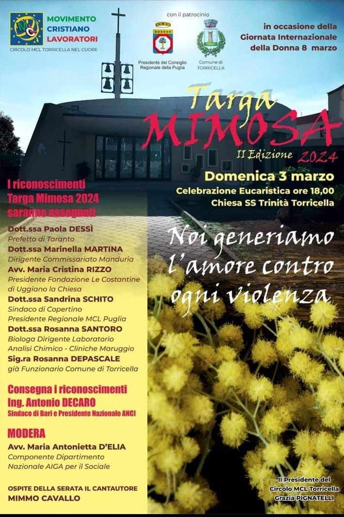 Si svolgerà questa sera, nella chiesa della SS. Trinità, la seconda edizione della cerimonia di consegna del riconoscimento Targa Mimosa. L’evento, promosso in occasione della Giornata Internazionale della Donna (che si celebra l’8 marzo), è organizzato dal Movimento Cristiano Lavoratori (la cui presidente è Grazia Pignatelli), con il patrocinio della Regione Puglia e dell’Amministrazione Comunale di Torricella.