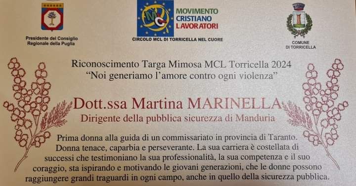 Si è svolta domenica sera nella chiesa “SS. Trinità” di Torricella la cerimonia della seconda edizione del riconoscimento “Targa Mimosa 2024”. A ricevere il prestigioso riconoscimento anche la dirigente del Commissariato del Commissariato di Polizia di Manduria Marinella Martina, che è stata premiata dal presidente dell'ANCI, Antonio Decaro, per essere stata la prima donna alla guida di un Commissariato in provincia di Taranto.