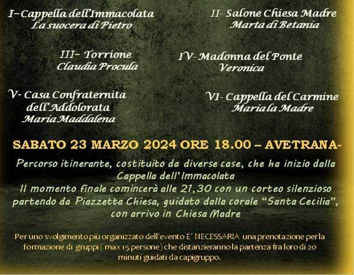 Questo il percorso e le varie scene della rappresentazione: 1) Cappella dell’Immacolata: la suocera di Pietro; 2) Salone chiesa Madre: Marta di Betania; 3) Torrione: Claudia Procula; 4) Madonna del Ponte: Veronica: 5) Casa confraternita dell’Addolorata: Maria Maddalena; 6) Cappella del Carmine: Maria la Madre.