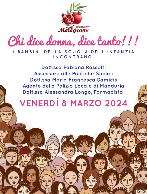 Il centro educativo Melograno, in occasione della Giornata internazionale della Donna, presenta l’incontro sul tema “Chi dice donna, dice tanto”, tra i bambini della scuola dell’infanzia e alcune donne che ricoprono un ruolo all’interno della società e nel mondo del lavoro.