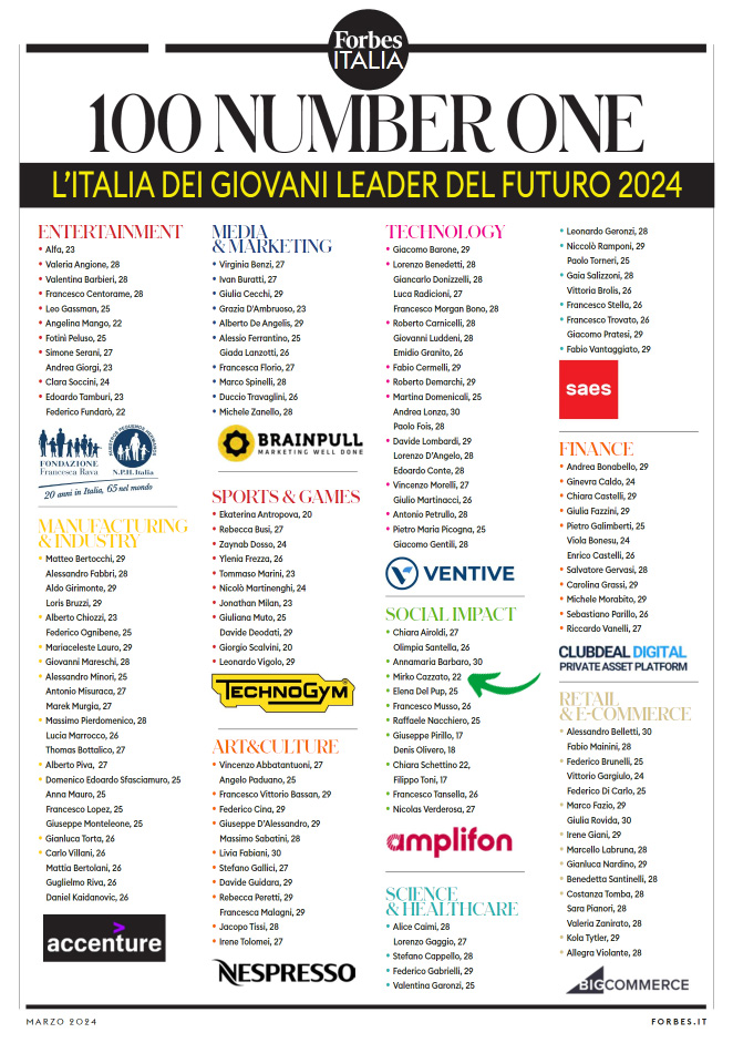 Gli altri Under 30 selezionati nella categoria “Social Impact” sono Chiara Airoldi (27), Olimpia Santella (26), Annamaria Barbara (30), Elena Del Pup (25), Francesco Musso (26), Raffaele Nocchiero (25), Giuseppe Pirillo (17), Denis Oliviero (18), Chiara Schettino (22), Filippo Toni (17), Francesco Tansello (26) e Nicolas Verderosa (27).