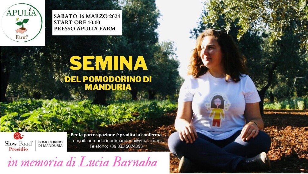 La Comunità dei Produttori del Pomodorino di Manduria, presidio Slow Food, si prepara a celebrare un evento unico in onore della straordinaria vita di Lucia Barnaba, fondatrice di Apulia Farm, recentemente scomparsa a causa di una brutta malattia. La giornata di semina del Pomodorino di Manduria si terrà il 16 marzo alle 10 presso Apulia Farm, in contrada Potenti, Manduria.