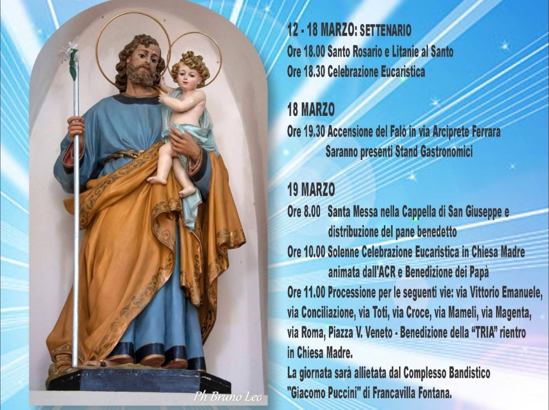Ritorna ad Avetrana, ancora una volta, il tradizionale appuntamento della festa di S. Giuseppe, caratterizzata da elementi tipici della pietà popolare salentina, quali il falò, la Processione, la Benedizione del pane e della Tria, nelle tradizionali “mattre”, preparate dalle associazioni locali in piazza Vittorio Veneto