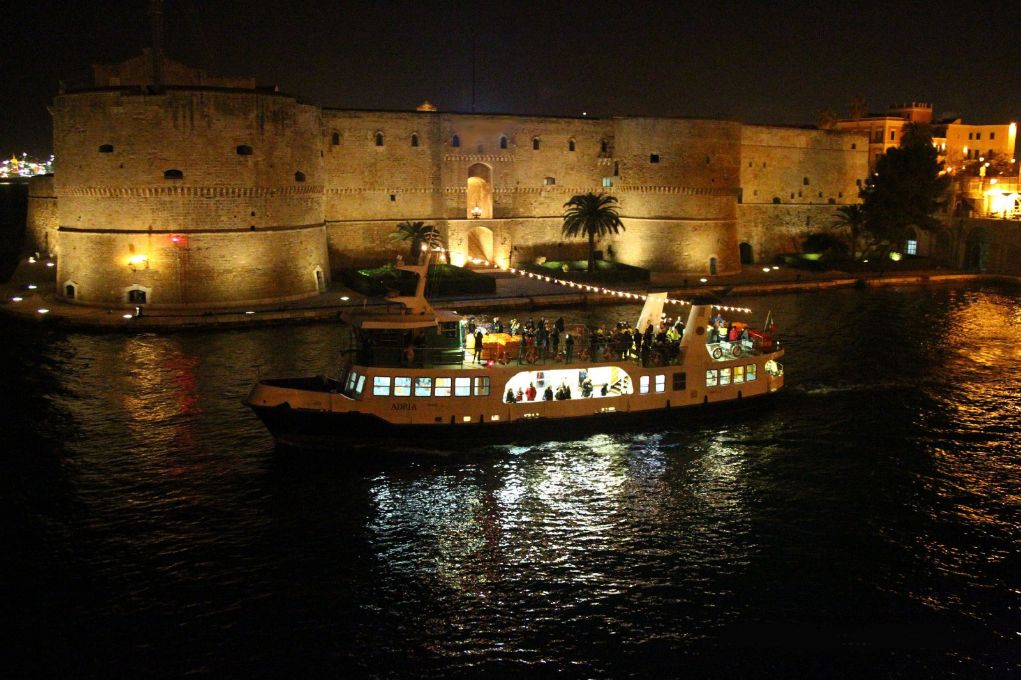 Di lì la motonave inizierà il tragitto per raggiungere il Mar Grande attraversando il Canale Navigabile, passando così sotto il Ponte Girevole e di fianco al castello Aragonese, uno degli scorci più affascinanti di Taranto, da dove è poi possibile ammirare il Lungomare e la Città vecchia, uno spettacolo mozzafiato reso ancora più suggestivo dall’atmosfera notturna.