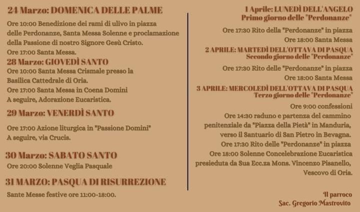 Questo il programma delle celebrazioni dei riti della Settimana Santa e delle Perdonanze nella parrocchia di San Pietro in Bevagna.