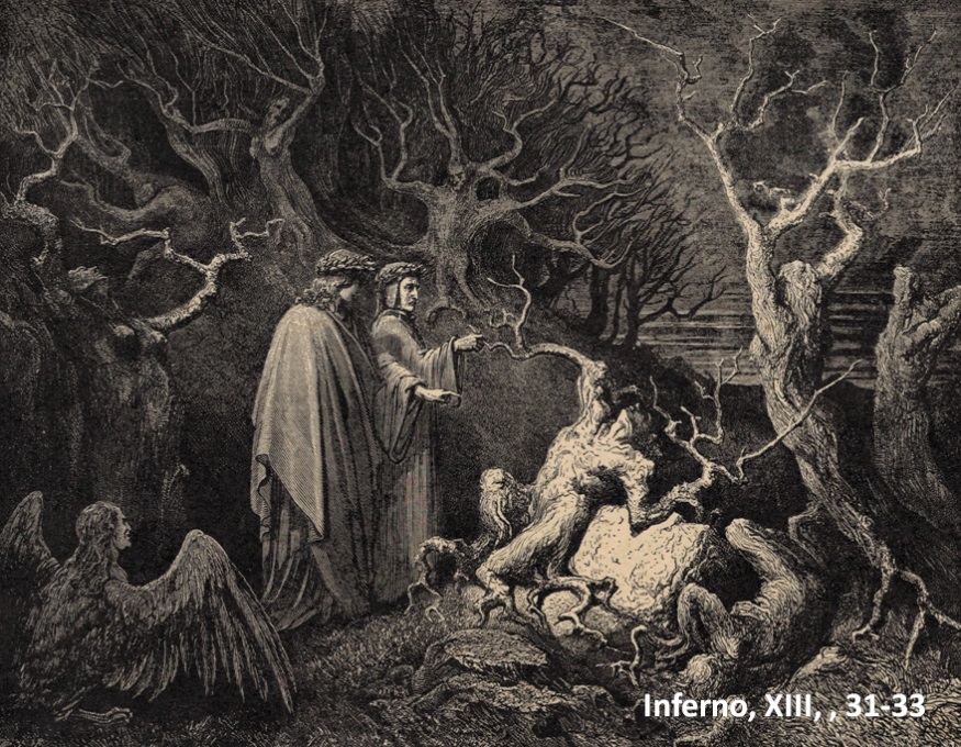Già Pier della Vigna, nel canto XIII dell’Inferno, dal verso 94 al 100, aveva descritto la trasformazione delle anime dei suicidi in piante: “Quando si parte l’anima feroce / dal corpo ond’ella stessa s’è disvelta / Minoss la manda a la settima foce. / Cade in la selva, e non l’è parte scelta; / ma là dove fortuna la balestra, / quivi germoglia come gran di spelta. / Surge in vermena e in pianta silvestra”.
