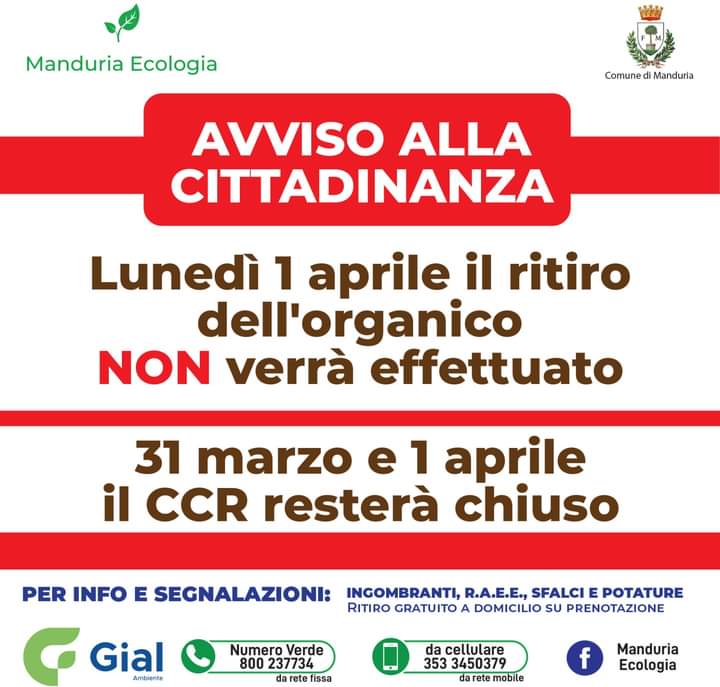 L’azienda titolare del servizio di raccolta dei rifiuti avvisa la cittadinanza che, a causa della chiusura dell’impianto di compostaggio, lunedì 1 aprile il ritiro dell'organico NON verrà effettuato.