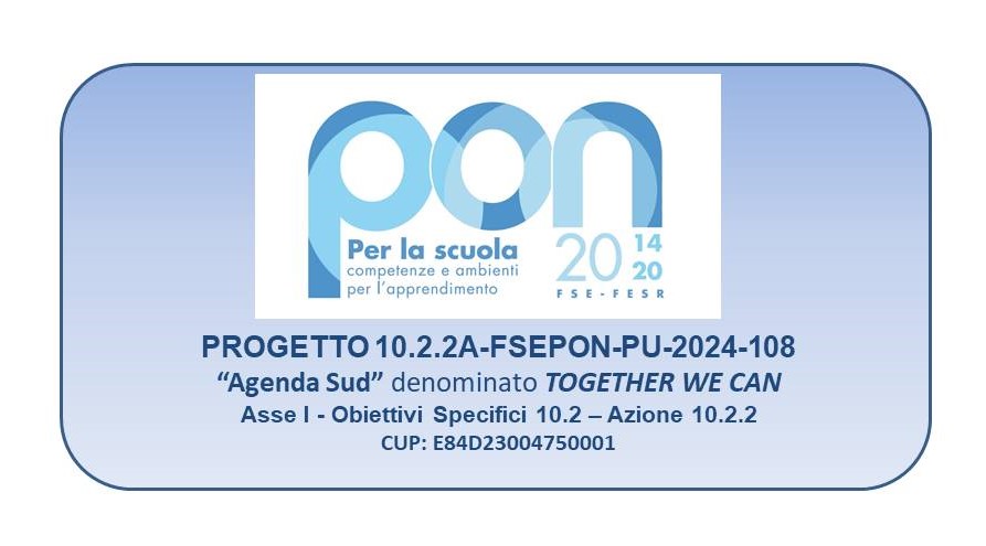 L’istituto comprensivo “Francesco Prudenzano” di Manduria è stato beneficiario del finanziamento relativo al progetto PON FSE 2014-2020 – Asse I – Istruzione – Obiettivo Specifico 10.2 – Azione 10.2.2 – Nota di Adesione prot. n. 134894 del 21 novembre 2023 – Decreto del Ministro dell’Istruzione e del Merito 30 agosto 2023, n. 176 – c.d. “Agenda SUD”. Titolo del nostro progetto: “Together We Can” – codice identificativo: 10.2.2A-FSEPON-PU-2024-108.