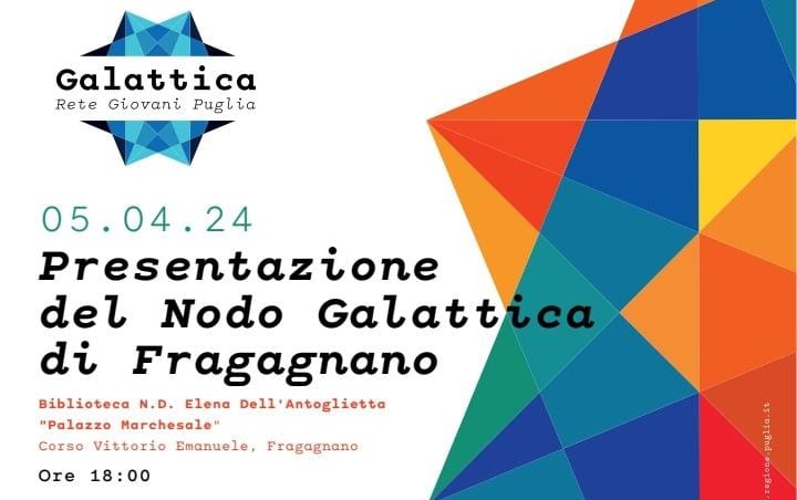 Venerdì 5 aprile, a partire dalle ore 18, nella biblioteca comunale “Elena Dell’Antoglietta” è in programma l’inaugurazione ufficiale del nodo di Fragagnano del network regionale "Galattica – Rete Giovani Puglia".