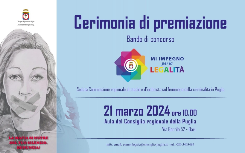 Nei giorni scorsi, il liceo artistico “V. Calò” di Manduria, vincitrice di quattro premi su otto per la provincia di Taranto, è stata invitata a partecipare alla cerimonia di premiazione e consegna degli attestati del concorso per le scuole pugliesi “Mi impegno per la legalità”. Uno dei lavori dedicato a Renata Fonte ha ricevuto il primo premio e un altro è stato utilizzato come copertina della locandina d’invito all’evento.