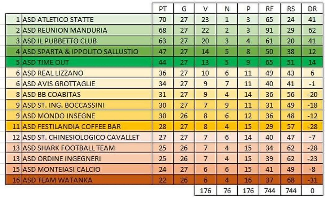Questa, infatti, la situazione di classifica attuale per i primi tre posti: 70 Atletico Statte; 68 Reunion Manduria; 63 Il Pubbetto Team.