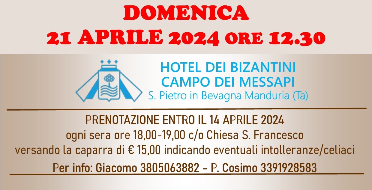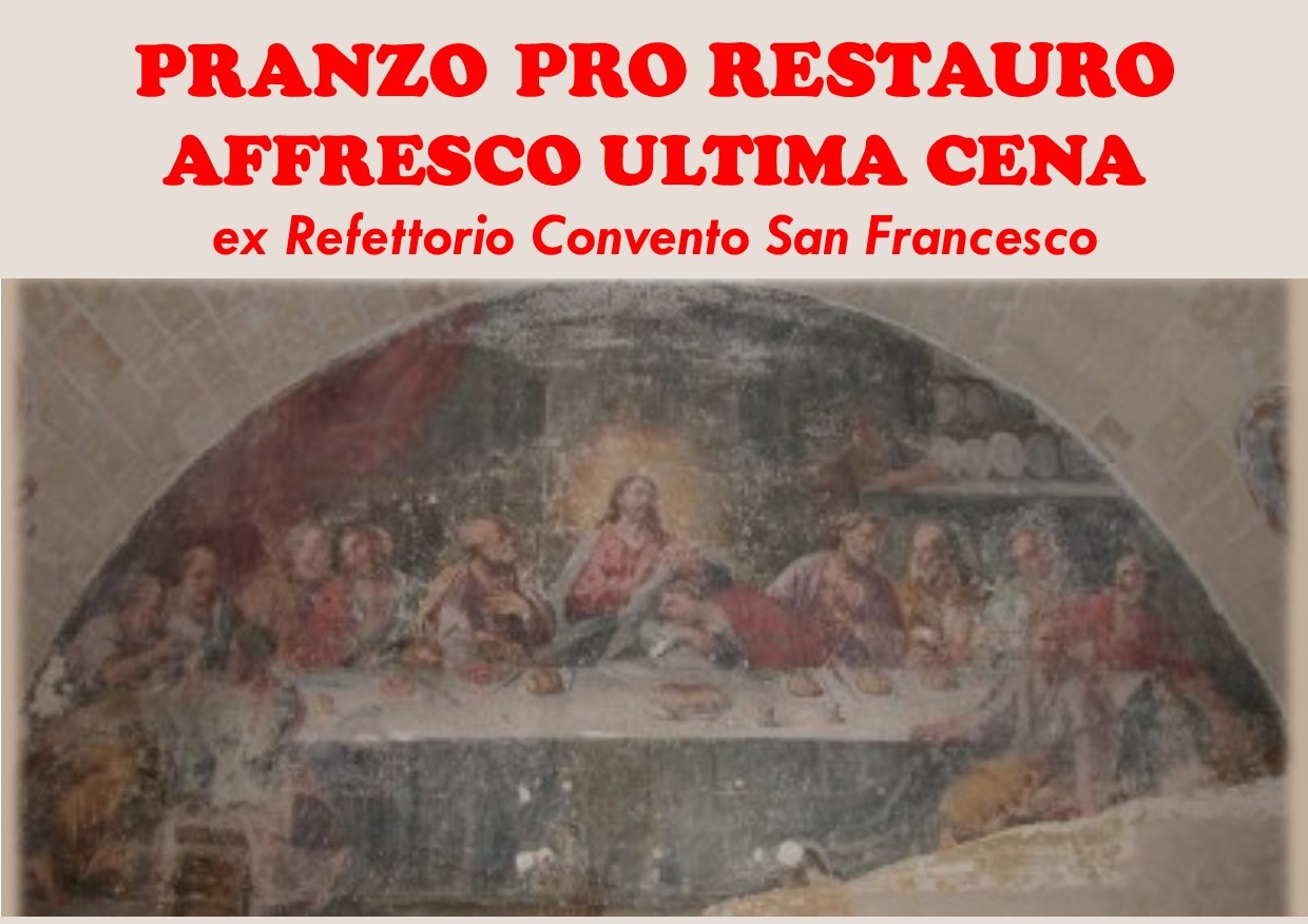 I Frati Minori, in collaborazione con l’Ordine Francescano Secolare, per continuare la raccolta fondi per il restauro dell’affresco dell’ultima cena presente nell’ex refettorio del convento San Francesco in Manduria, hanno promosso un pranzo che si svolgerà domenica 21 aprile, alle ore 12,30, presso l’hotel dei Bizantini di S. Pietro in Bevagna.