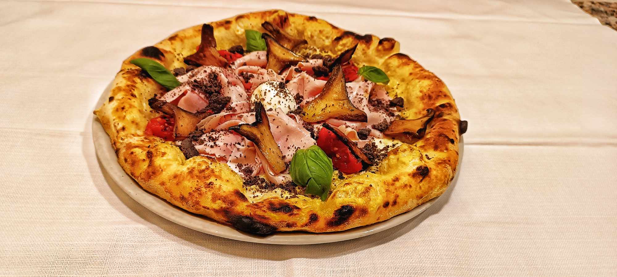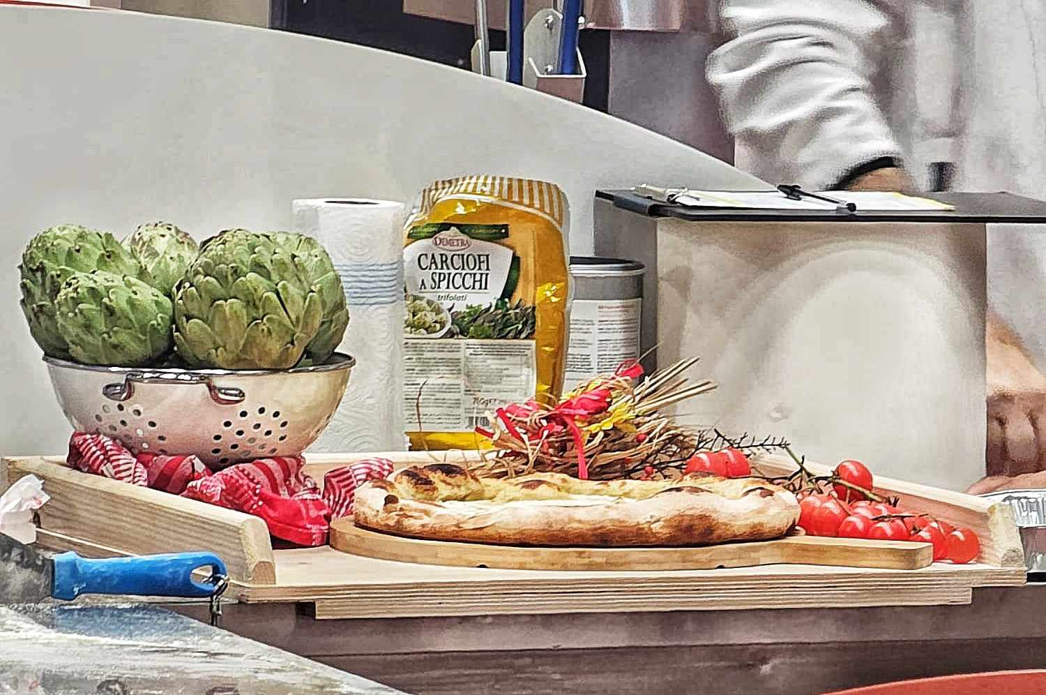 Ingredienti: vellutata di carciofi brindisini; fior di latte pugliese; prosciutto cotto di Parma alta qualità; pomodorini rossi semi dried; carboncello in doppia cottura (trifolati e grigliati); salatino alle olive nere; bocconcino di bufala campana; basilico; olio E.V.O.