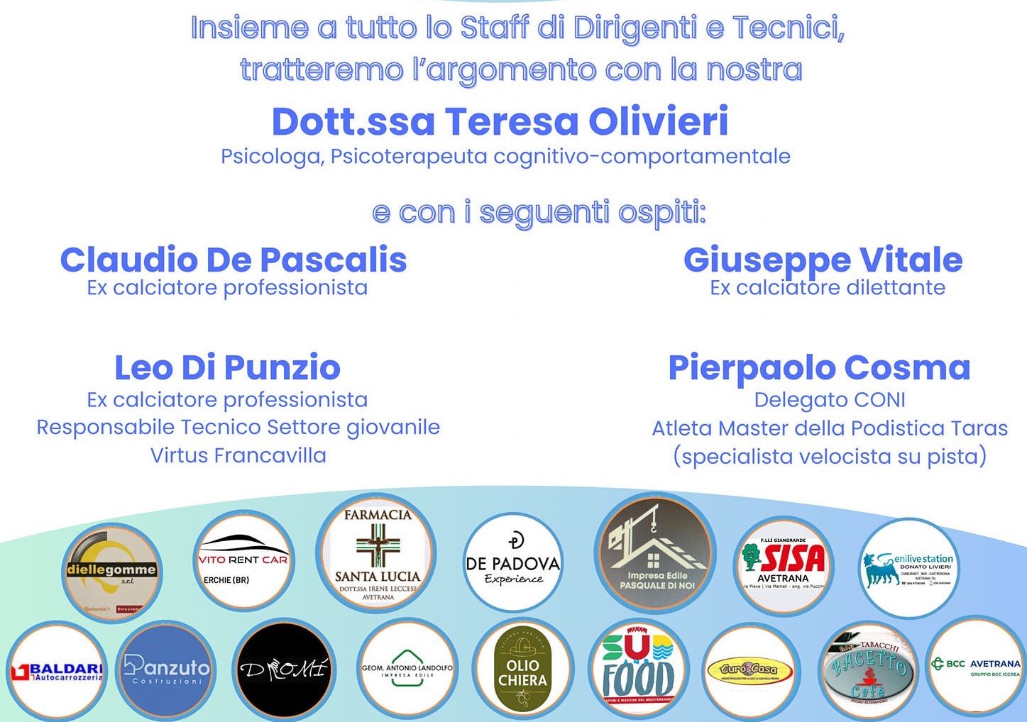 Interverranno, gli ex calciatori Leo Di Punzio, Claudio De Pascalis e Giuseppe Vitale, la psicologa Teresa Olivieri e il delegato CONI Pierpaolo Cosma