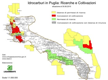 Per avere una fotografia più puntuale del fenomeno basti pensare che il suolo pugliese è stato trivellato sinora da 9 pozzi di petrolio sulla terraferma e 5 sul fondo marino. Le provincie maggiormente coinvolte dalle trivellazioni di idrocarburi sulla terraferma sono quelle di Taranto, Foggia e Brindisi. La Provincia di Taranto, infatti, vede sacrificato il 63% del proprio territorio agli idrocarburi, quella di Foggia il 30% e quella Brindisi il 10%. Interessate anche le Province di Barletta-Andria-Trani e Lecce, rispettivamente con il 4% e 0,4% del proprio territorio.