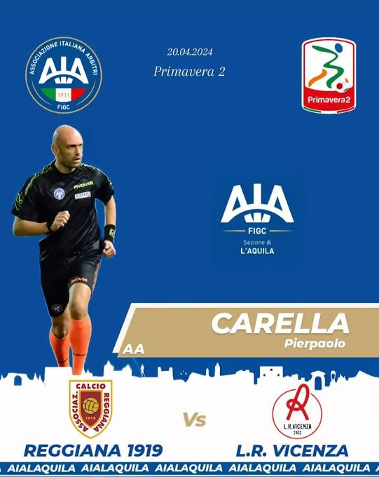 Pierpaolo Carella (AIA L’Aquila) designato come assistente per l’incontro fra Reggiana e L. R. Vicenza. E’ valido per il campionato Primavera 2 ed è in programma per sabato pomeriggio, con calcio d’inizio alle ore 15, allo stadio comunale di Casalgrande (Reggio Emilia).