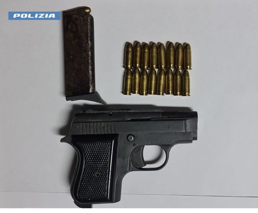 L’ispezione dei luoghi ha dato ben presto i risultati sperati. I poliziotti, all’interno di un armadio della stanza da letto, hanno recuperato una pistola semiautomatica con matricola abrasa calibro 6.35 custodita in un astuccio in stoffa, completa di caricatore con all’interno tre cartucce ed in un contenitore per medicinali altri 16 proiettili dello stesso calibro di quelli ritrovati in precedenza.