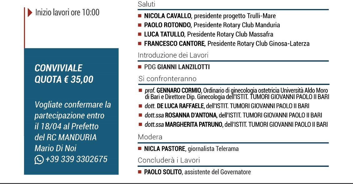E’ organizzato dai presidenti dei Rotary Clubs Manduria (Paolo Rotondo), Massafra (Luca Tatullo) e Ginosa Laterza (Francesco Cantore)