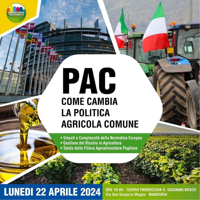 Manduria in Movimento, coordinamento cittadino per la valorizzazione e promozione del territorio messapico, ha quindi promosso per lunedì 22 aprile, alle ore 19, nel teatro della parrocchia San Giovanni Bosco di Manduria, un incontro di approfondimento intitolato “Pac, come cambia la politica agricola comune”.