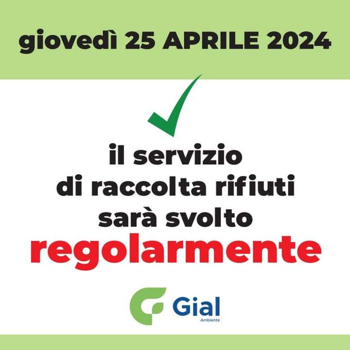 Domani mattina, 25 aprile, il servizio di raccolta dei rifiuti sarà svolto regolarmente.