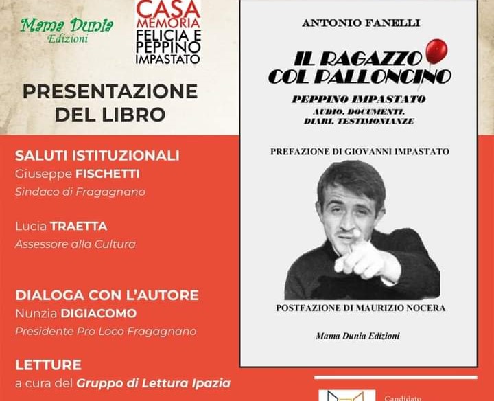Domani sera, alle ore 19.30, presso la biblioteca Elena Dell’Antoglietta, situata nel palazzo Marchesale, verrà presentato il libro: “Il ragazzo col palloncino. Peppino Impastato” di Antonio Fanelli, edito da Mama Dunia.