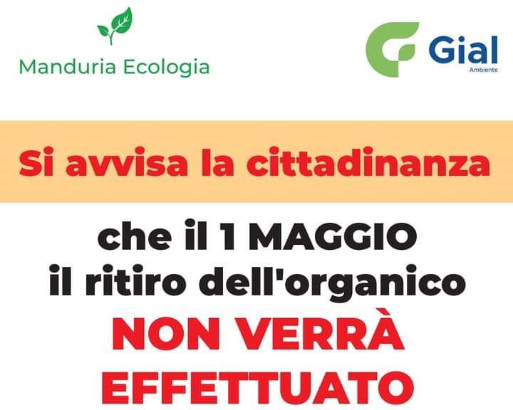 Domani, festa del Primo Maggio, il servizio di raccolta dei rifiuti non verrà effettuato: l’impianto di compostaggio resterà chiuso. A darne notizia è l’azienda appaltatrice attraverso un post.