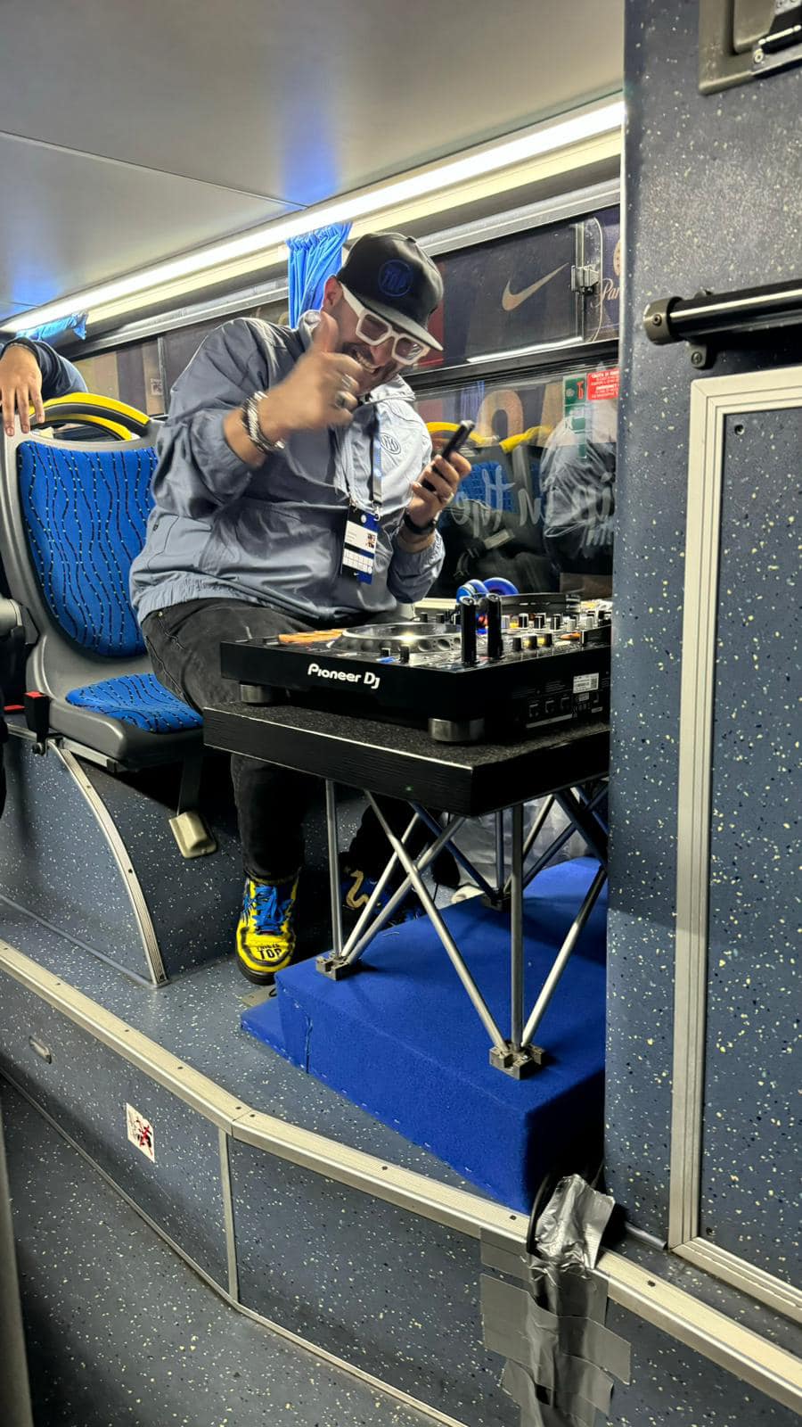 Il dj manduriano Marietto sul pullman dell’Inter nella festa per lo scudetto di domenica scorsa.