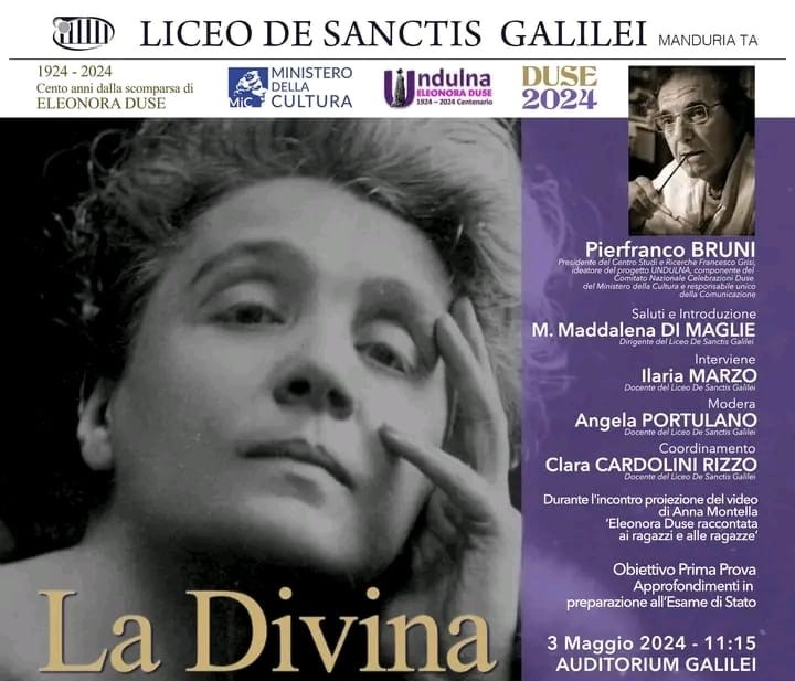 Domani (3 maggio), alle 11.15, nell’auditorium Galilei del liceo De Santis-Galilei di Manduria, sarà reso omaggio a Eleonora Duse nel centenario della scomparsa, con una mattinata dedicata al ruolo importante che l’attrice ha avuto tra fine Ottocento e i primi venti anni del Novecento.