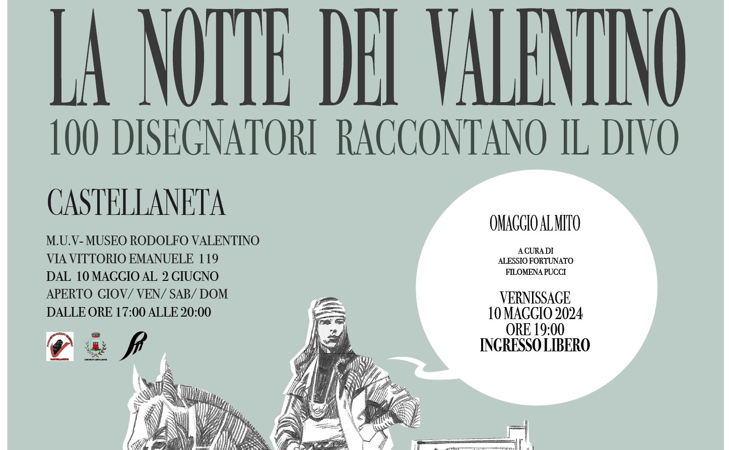Venerdì 10 maggio, alle ore 19, sempre nelle sale del museo Rodolfo Valentino, è in programma l’inaugurazione della mostra di disegni “La notte dei Valentino - 100 disegnatori raccontano il divo” a cura di Alessio Fortunato e Filomena Pucci. Provenienti da ogni parte d’Italia e anche dall’estero, gli interessanti artisti di questa raccolta, con le loro matite talentuose, hanno omaggiato il mito di Rodolfo Valentino ognuno con il proprio tratto e la propria sensibilità, dando, però, unica voce e sostanza a qualcosa di inafferrabile: il sogno.