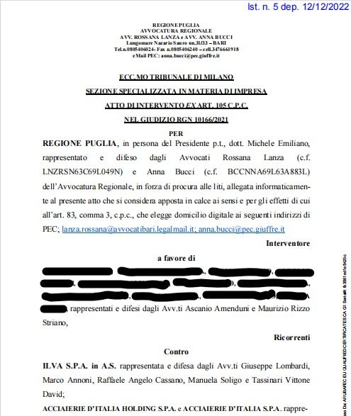 Nella prima immagine, riproponiamo la prima pagina dell’atto di intervento ad adiuvandum della Regione Puglia, depositato in data 12 dicembre 2022 presso il Tribunale di Milano, sezione specializzata in materia di impresa, con il quale la stessa Regione Puglia, in persona del presidente, dott. Michele Emiliano, aderiva all’azione inibitoria tendente alla chiusura dell’area di produzione a caldo, promossa da 10 adulti e un bambino di Taranto.