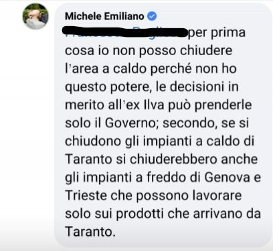 Nella seconda immagine, la risposta di Michele Emiliano a una domanda di un tarantino, sotto un post di questa mattina che il presidente ha dedicato ai David di Donatello vinti dal film “Palazzina Laf”. Qui, il presidente dichiara che la chiusura dell’ex Ilva è materia del Governo (nonostante gli avvocati della Regione Puglia si siano presentati davanti alla Corte di Giustizia dell’Unione Europea per la chiusura dell’area a caldo).