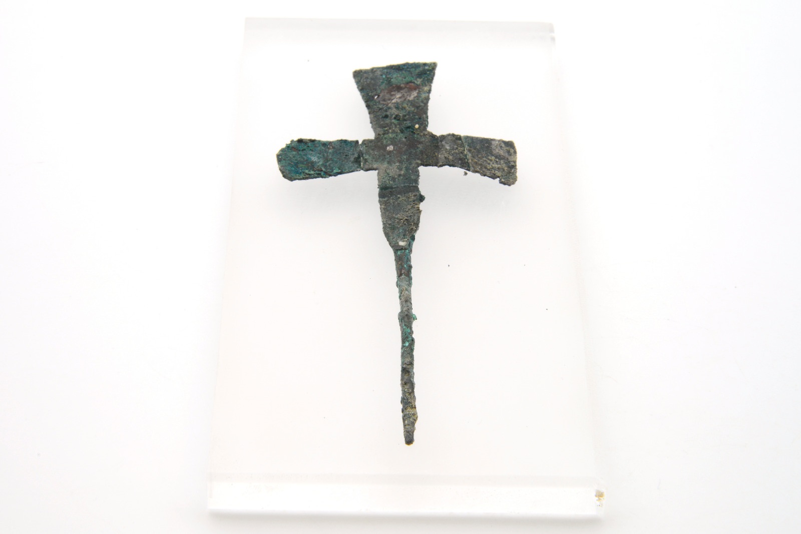 La croce funeraria, databile tra la fine del VII e l’inizio dell’VIII secolo d.C., si presenta in lega d’argento e sotto forma di lamina sottile, con estremità patenti e provvista di un ago per l’inserimento della stessa nell’abito o nel sudario.