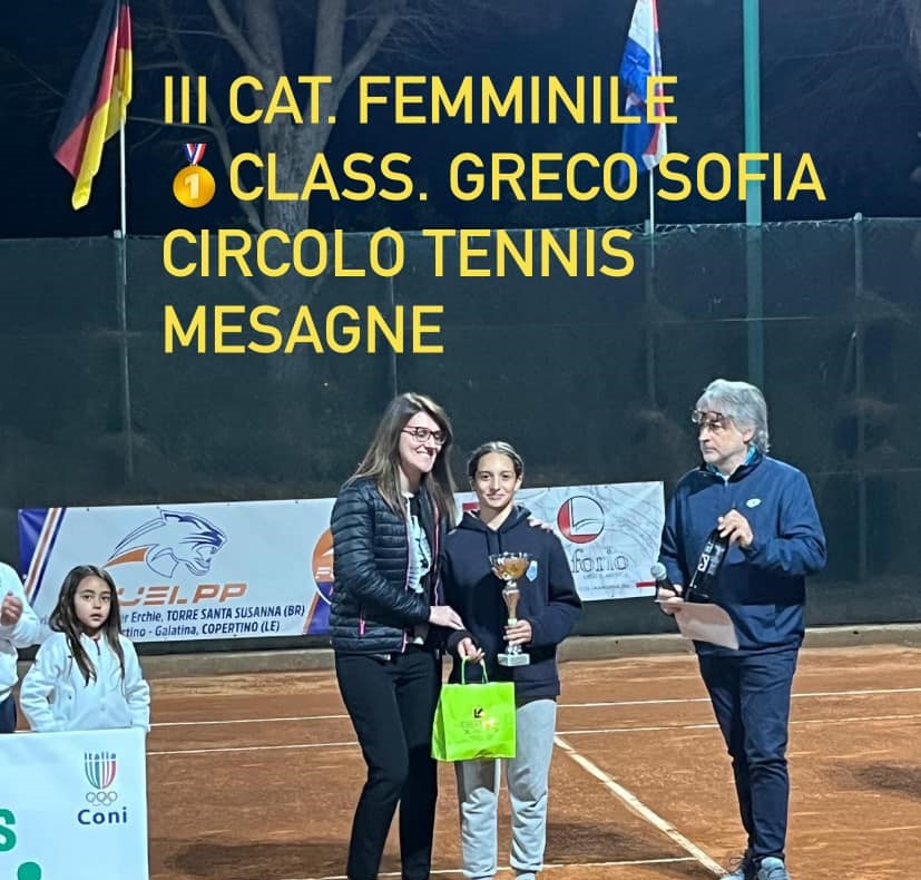 III CATEGORIA: si è imposta Sofia Greco, del Circolo Tennis di Mesagne, che in finale ha avuto la meglio su Evelyn Calò, del Circolo Tennis di Manduria.