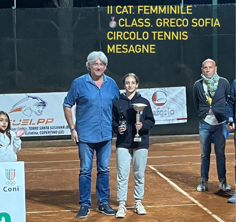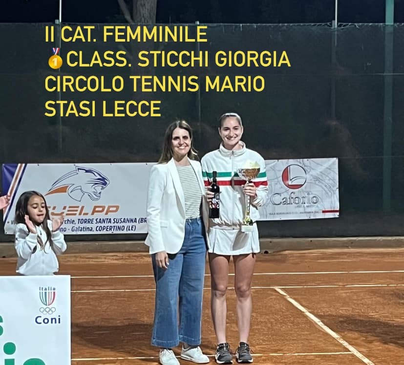 II CATEGORIA: ha vinto Giorgia Sticchi, del Circolo Tennis di Lecce, che in finale ha battuto Sofia Greco del Circolo Tennis di Mesagne.
