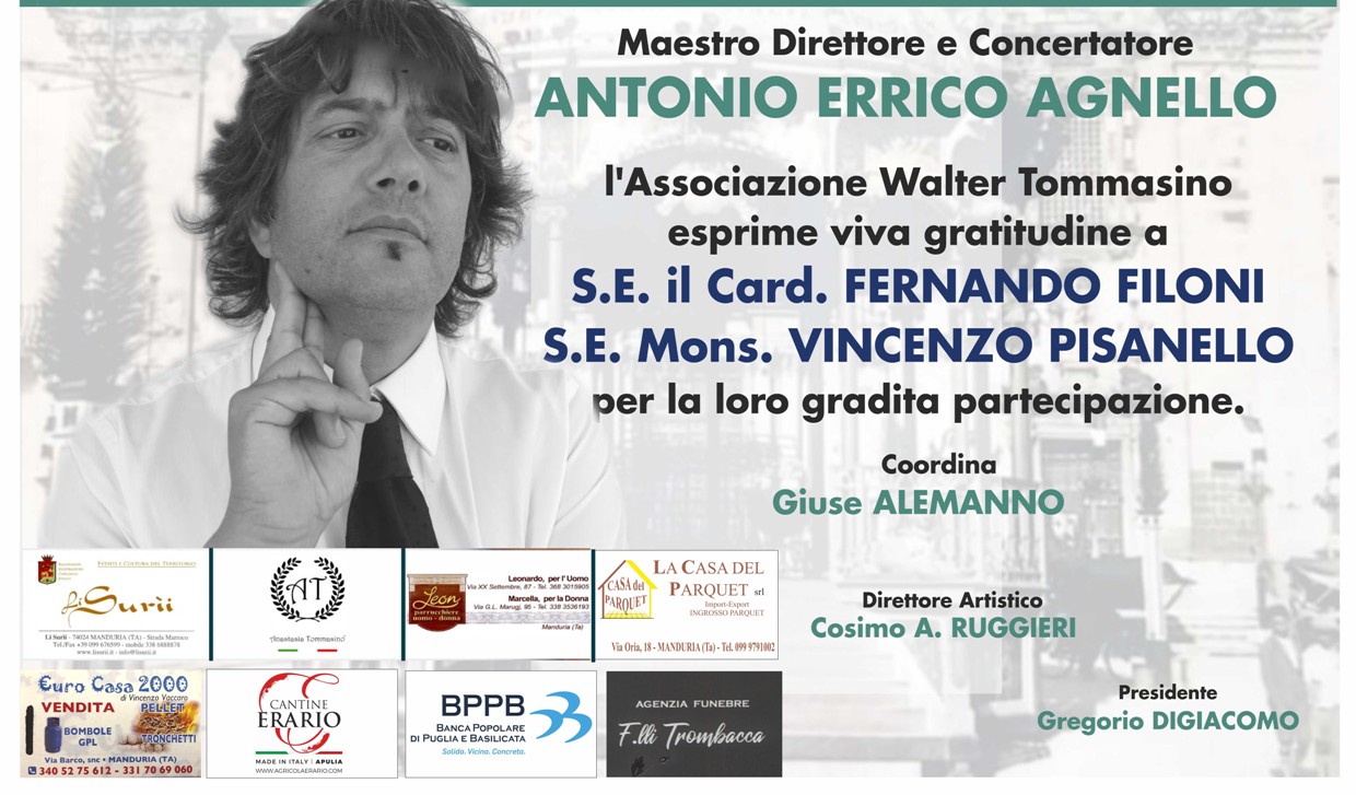 Capace di coinvolgere quaranta musicisti provenienti da Bari fino al Salento, la rinata banda cittadina risponderà alla bacchetta del direttore e concertatore M° Antonio Errico Agnello, già alla guida del sodalizio musicale manduriano dal 1995 al 2001. Con lui l'orchestra della città messapica ha avuto l'onore di essere la prima banda musicale in assoluto a esibirsi al prestigioso Festival Pucciniano di Torre del Lago (1998).
